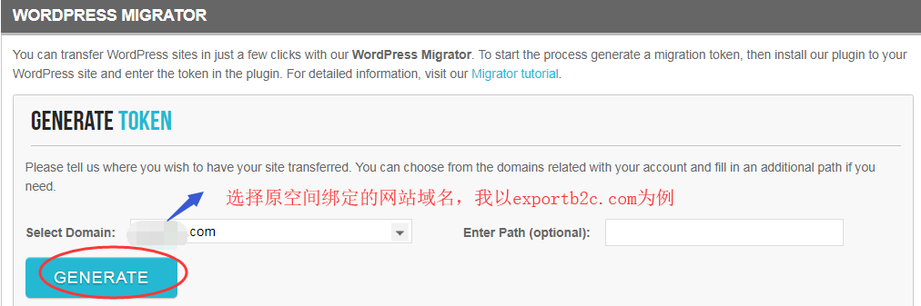 首先选择原Godaddy空间绑定的网站域名,之后点击‘Generate’生成一串口令作为备用。