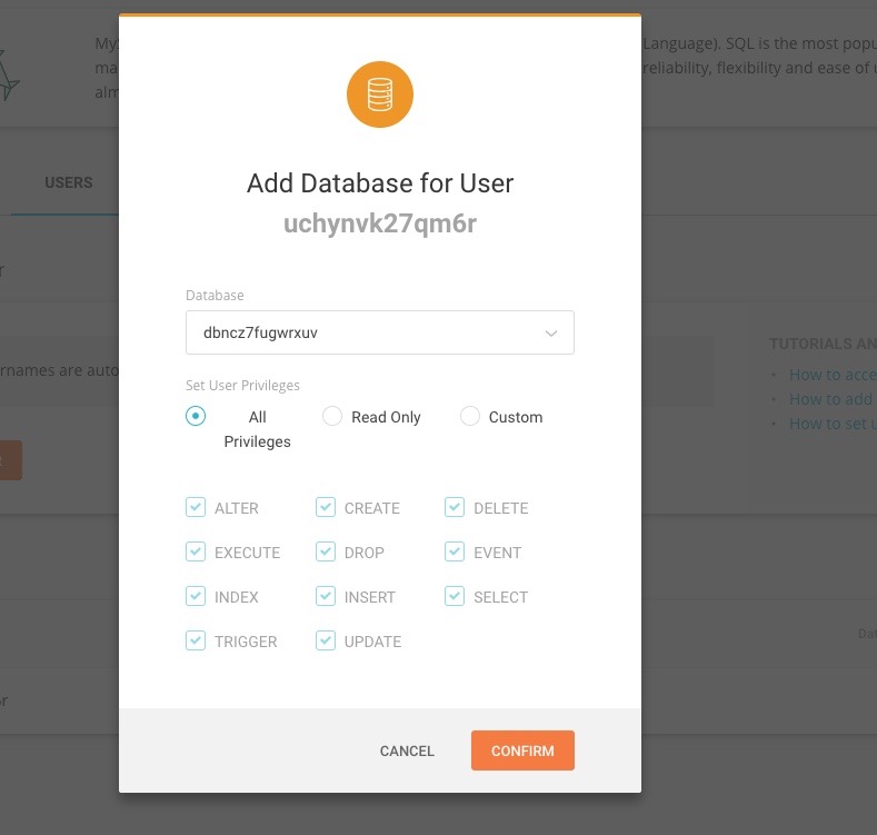 接下来,单击“用户”选项卡以创建新的数据库用户。单击创建用户。请记住,它们是自动生成的,一旦设置,您将收到包含用户名和密码的通知。